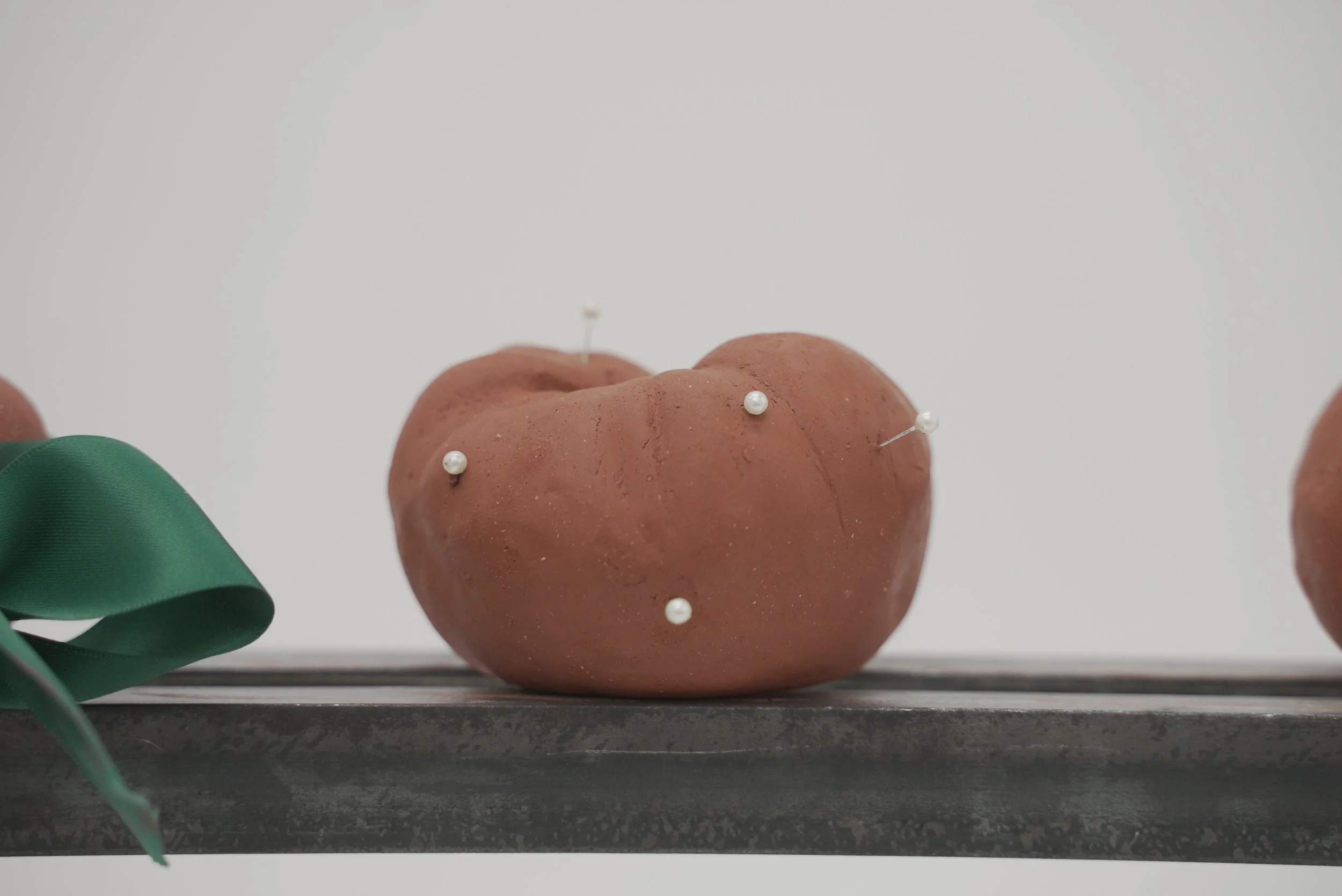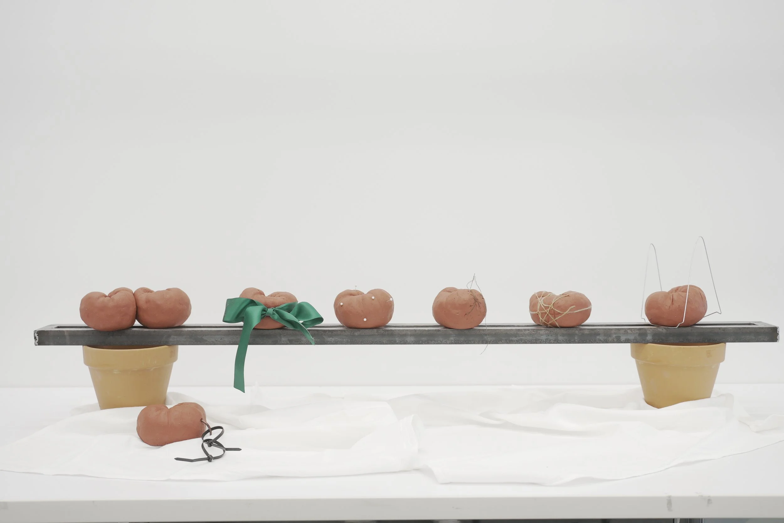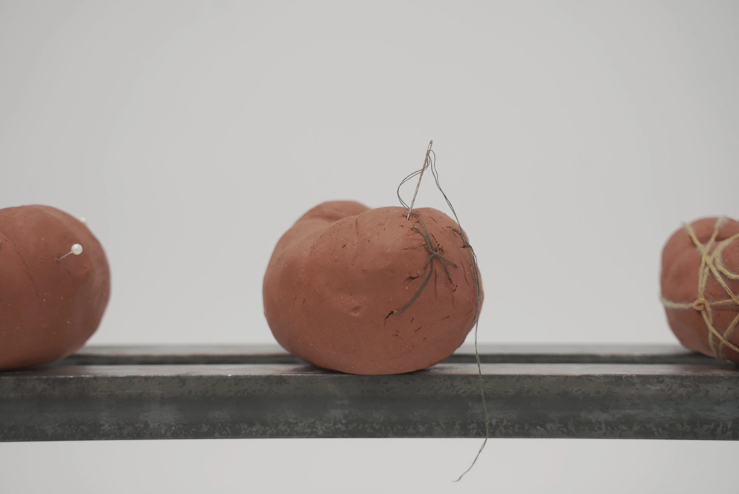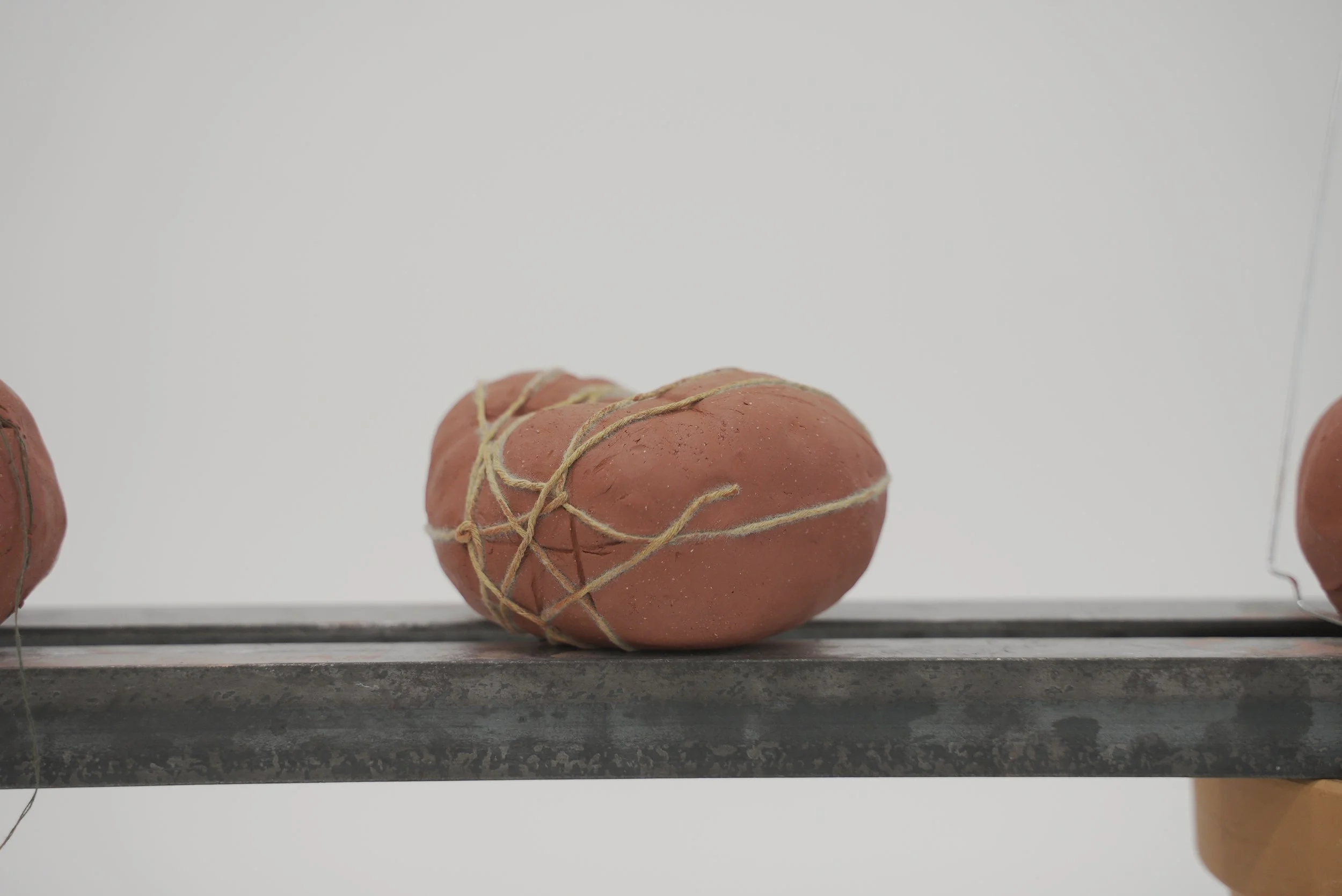 unfired clay, steel, terracotta, hemp cord, sewing pins, ribbon, cotton